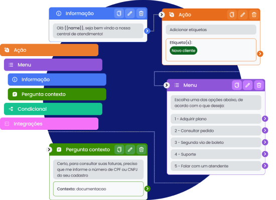 Possui suporte a integrações nativas e via webhook, além da capacidade de armazenar valores em campos personalizados. Também é possível criar verificações com condicionais, adicionar tags, horário de atendimentos, inteligência artificial e muito mais, as possibilidades são infinitas!